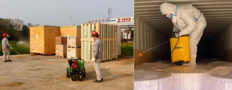 中國樂凱集團公共事業(yè)部嚴(yán)格落實防疫要求,進口到貨采取“多重消毒”,即進口集裝箱進入卸料區(qū)后,由消毒人員對車輛和集裝箱進行整體的外部消毒;打開集裝箱箱門后,消毒人員進入集裝箱,對箱內(nèi)貨物進行二次消毒